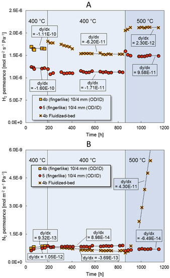 Hydrogen permeance (A) and nitrogen permeance (B) of membrane 4b in the fluidized bed and membrane 5 in the empty system.