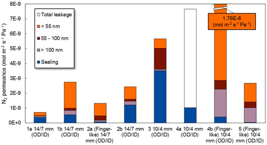 The blue part in the bars in Figure 10 shows which part was a result of leakages from the sealing. It is clear from the figure that the contribution of leakages from the sealing was the lowest for finger-like membranes 2a, 4b and 5 with only one sealing, which confirms the results obtained during the long-term stability tests that the sealing contributes partly to the nitrogen permeance and can be decreased by decreasing the number of sealings used. Moreover, it can be seen that the contribution of the sealing to the nitrogen permeance on membrane 3 was significantly higher because of the lower torque applied on the sealing. However, the increase in nitrogen permeation during the long-term stability test could also be related to the formation of large pores, as they show to have a significant contribution to the overall leakage rate as well. In membranes 1a, 1b, 2a and 2b most of the contribution is shown to result from pores with a size smaller than 55 nm. Membrane 4b and 5 show a large contribution of pores larger than 100 nm and pores smaller than 55 nm. The contribution of the large pores was expected for membranes 4b and 5 since minor pinholes were visible on the surface when the membranes were immersed in ethanol before the high temperature tests were carried out.