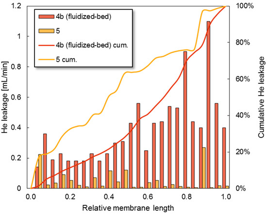 Figure 11 shows the distribution of the leakage rates along the membrane, where the relative-length 0.0 represents the tip of the finger-like membrane. From these results it can be observed that membrane 5 shows a relatively equal distribution along its length with some parts that show a slightly larger contribution with more pinholes. Peters et al. reported also an almost evenly distribution of the leaks for Pd membranes [30]. Membrane 4b which was in the fluidized bed showed a higher total helium flow rate; however, no significantly higher contribution is obtained from the finger-like part, suggesting that the finger-like part did not suffer more than the other parts in the fluidized bed. For membrane 4b the helium flow rate along the membrane increased with the length of the membrane. It is suspected that this is related to interactions of the catalyst particles and the Pd film in the fluidized bed reactor. An inherent property of a fluidized bed is that bubbles of gas rise through the bed of solid particles, the size of the bubbles grow along the reactor. These bubbles carry particles in their wake inducing a solids circulation [31]. As bubbles rise in the bed, they grow and rise with higher velocity, thereby also increasing the particle velocity. The higher particle velocity results in the increased energy of impact of the collisions of the particles on the membrane. The results suggest that the increase in leakage rate is related to the increase in the mechanical impact of the fluidized bed on the membranes. The temperature plays in this case a detrimental role in when the collisions of the particles become destructive to the membrane.