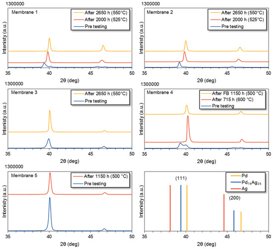 To verify whether there is chemical interaction and to investigate the alloying condition, XRD analysis has been used. Samples of the pre-tested membranes were compared with samples of the membranes after the tests. The results of the XRD analysis are presented in Figure 12. The only peaks that are distinguished correspond to either Pd, Ag or the alloy of Pd75Ag25. The pre-testing sample showed for membranes 1, 2 and 4 a split in the peak indicating that the alloy of Pd-Ag is not completely formed yet during the alloying after preparation. The difference in required alloying time is most likely a result of differences in the co-deposition during the ELP. This alloying can explain the increase in the hydrogen permeance during the first 200 hours of membranes 1 and 2 as opposed to membrane 3 in the long-term test [27]. The intensity of the used membrane 1, 2 and 3 are 2 to 3 times larger compared to the fresh membrane samples. The differences in the peak width and intensity indicate a change in morphology. According to the Scherrer Equation (1), the crystal size is inversely proportional to the peak width. In Table 4, the following crystal sizes were obtained for the tested membranes applying the Scherrer equation: