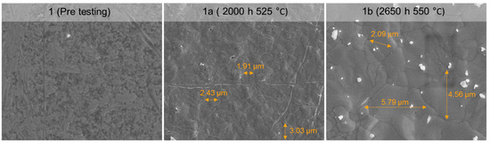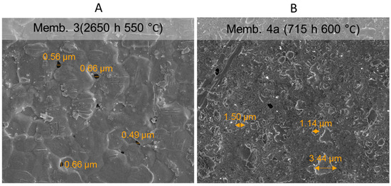SEM analysis is used to further investigate the changes in the surface of the selective layers and to measure the thickness of the membranes, pre and post testing. Figure 13 shows the evolution of the surface of membrane 1 during the long-term test. Prior to the test, a smooth surface with a very small grain size can be observed. After 2000 h of operation and a temperature up to 525 °C the grain size is increased, which even further increases after 2650 h up to 550 °C. As can be seen, the grain boundary density is decreased and, as mentioned before, this can explain the observed decrease in the hydrogen flux. Besides the formation of larger grains, the membranes showed the formation of small pinholes. The formation of pinholes was relatively pronounced for membrane 3, where some of the black spots appear to be holes between the grain boundaries, as shown in Figure 14A. The sizes of these defects, however, do not directly correspond to the size of the pinholes found by porometry. This would suggest that below the surface there is a narrower pitch between these defects which is measured by the porometry, while the growth and agglomeration of the grains result in the formation of these defects. Figure 14B shows the surface of membrane 4a, where the grains show a wide size distribution and seemed to have grown irregularly. Also from the porometry test it was concluded that the surface of membrane 4a contributes significantly to the nitrogen permeation. Moreover, membranes 1, 2, 3 and 4a showed an increase in crystal growth from the XRD results. Previous works indicated that microstructural changes of the surface result in the formation of void spaces [30,34,35,36]. It can therefore be suspected that the formation and connection of these defects resulted in the formation of pinholes, and at higher temperatures the more irregular surface deformation increases the number of defects formed and thereby the chance of the formation of pinholes. The thickness of the selective layer was also measured on a cross-section of the membranes. The thickness of the selective layer of membranes 1, 2, 3, 4a and membrane 5 before fluidization showed no changed compared to the fresh sample thickness of 4 to 5 microns. Membrane 5 was expected to have a higher thickness, which could also be expected from the permeation results. However, from the cross-section measured this could not be accurately confirmed.