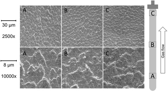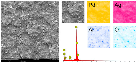 Membrane 4b that was operated in the fluidized bed was divided into 3 sections to inspect the change of the surface along the membrane. In Figure 15 the surface of the membrane is shown for the three sections at two different magnifications, with the flow direction being from the bottom to the top of the images. A clear pattern is visible in the flow direction were towards the top the pattern becomes less spikey and more flat. The pattern looks like overlapping grains, like a fish scale. As mentioned in the discussion of the permeation results, the main increase in nitrogen permeation was found to occur between 450 °C and 500 °C. Helmi et al. [37] showed that no significant surface effects were visible after fluidization at 400 °C. Therefore, it is expected that the main surface deformation took place between 450 °C and 500 °C. It is expected that a combination of operation at the temperatures above 450 °C, and the scouring action of the fluidized particles, results in an increase in surface energy. Since the palladium layer is ductile and the hardness of the palladium decreases with temperature, the increased surface energy could allow ductile deformation of the PdAg layer. EDS analyses, as shown in Figure 16, revealed that the pattern formed on the surface is relatively homogeneous in composition indicating more mechanical interactions than chemical interactions with the catalyst. Beside the pattern, the surface itself also shows many small darker spots. From the EDS results in the dark spots a high presence of Al and O was found. Closer inspection showed that the dark spots where mainly holes. The high concentration of Al and O could be explained due to fines of the catalyst that are stuck in the holes of the surface. The thickness was measured with SEM on 4 different points along the membrane, using Figure 15 as a reference, at point A, Between A and B, Between B and C and at point C. The average thickness is shown to decrease from bottom to top with about 1 µm. This decrease in thickness seems to corroborate with the the leak distribution results that showed a larger leakage contribution towards the top of the membrane as a result of the increased particle velocity. This shows that the configuration and design of a system can significantly affect the stability of the membranes, since the hydrodynamics play an important role in the particle velocities. Possible solutions to avoid the erosion effects observed in this work can be found in protecting the membranes with a porous ceramic layer, as presented in the recent work by Arratibel et al. [38].