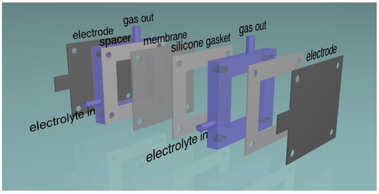 All ageing experiments were conducted using a constant current power supply, connected to a two-electrode laminated electrolytic cell, which was primarily comprised of laser-cut acrylic plastic (see Figure 1) []. A Zirfon™ membrane was used to keep the evolved gases separate, and the distance between electrodes was approximately 30 mm []. Two different ageing protocols were followed, as detailed in Table 1. It was observed that at the higher current density a stronger electrolyte was needed to keep the total voltage drop across the electrolytic cell, and with it the associated ohmic heating, within reasonable limits. The choice to use NaOH instead of the more usual KOH was made because it is cheaper, and therefore more practical for commercial applications. Also, even though the safety data sheet states that it must never be disposed of down the drain, it is widely recognized and used as a drain cleaner, and therefore accidental spillage or leakage into the sewer is a manageable environmental hazard.