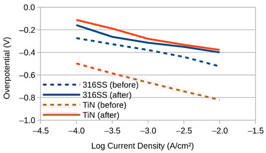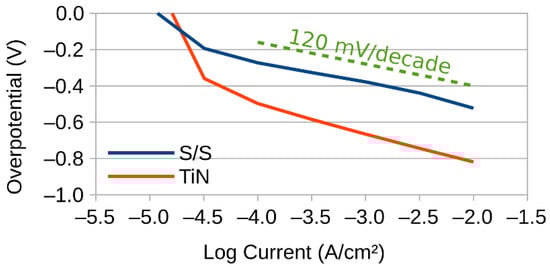 The electrical performance comparison of both the stainless-steel and TiN-coated cathodes is as shown in Figure 2. These results show that the Tafel slopes for both materials are very nearly the same. Both are largely parallel to the 120 mV/decade value (shown as a dashed line), which is the value anticipated from theoretical calculations within the literature []. However, the coated electrode requires approximately an extra 300 mV of overpotential to achieve the same current density as the uncoated material.