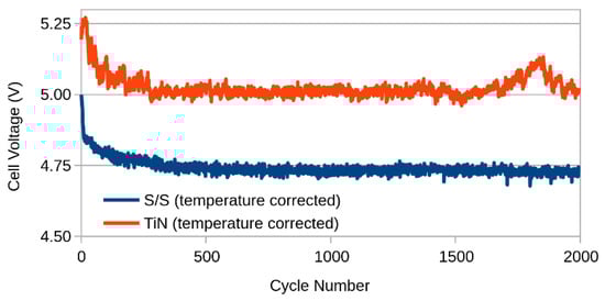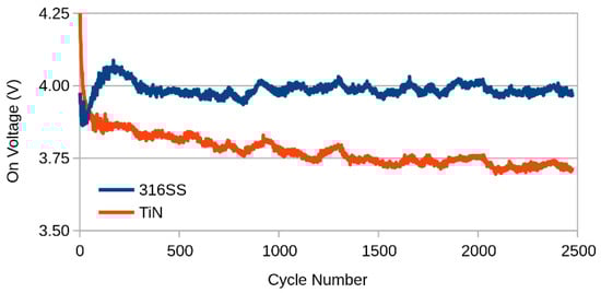 Here it can be seen that the voltage was lower in general, due to the higher concentration of the electrolyte. Also, the initial 300 mV difference was quickly overturned, and thereafter the gap gradually extended until finally the TiN cell outperformed the stainless-steel cell by about 250 mV. This performance improvement is not necessarily attributable to the cathode, since it is a two-electrode cell, and therefore does not permit an individual assessment to be made of either electrode. To assess this, three-electrode experiments were again performed to measure the electrical performance of the cathodes in isolation, as shown in Figure 6.