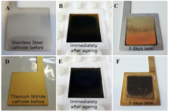 Figure 3 shows the visual representation of the electrodes after Ageing Protocol A. Here it can be seen that the TiN-coated cathode (Figure 3e) retained much of its original golden colour, as opposed to the uncoated stainless steel (Figure 3c), which became almost purple.