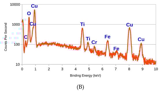 The nitrogen peak reappearance indicates that the stainless steel remained protected and coated with TiN at depth, but overall the electrode incurred a loss of electrical performance caused by the oxide on the surface, which is insulating at these voltages []. It is therefore concluded that the phase composition of the anodically altered coating changes from TiOx at the surface, to TiN at depth, via a mixture including titanium oxynitride, as is confirmed by the change to an orange-brown colour [] and the changing XPS [,,]. The practical significance of this is that incorrect wiring or fluctuations in the polarity of the electrical input would fast render the electrolysis equipment ineffective. Therefore, in practice some sort of protection would need to be provided against reverse polarity, for example via the use of a diode and fuse, or alternatively a field-effect transistor (FET). Both solutions, however, would incur some liability, either in terms of cost or reliability.