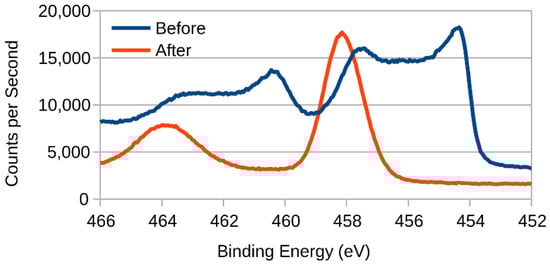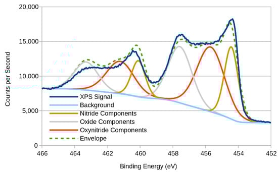 In order to identify these components, the results were analysed using CasaXPS software, which is able to perform peak fitting. Typically, all 2p electron orbitals produce an XPS signal consisting of doublets, whereby the lower binding energy peak (2p1/2) has double the area of the higher peak (2p3/2), but the same full-width half-maximum (FWHM). However, it is known that the FWHM constraint is not entirely applicable to titanium, due to the Coster‒Kronig effect, which causes a broadening of the 2p1/2 peak []. Nevertheless, it is still possible to perform outline peak deconvolution, the results of which are as presented in Figure 11.