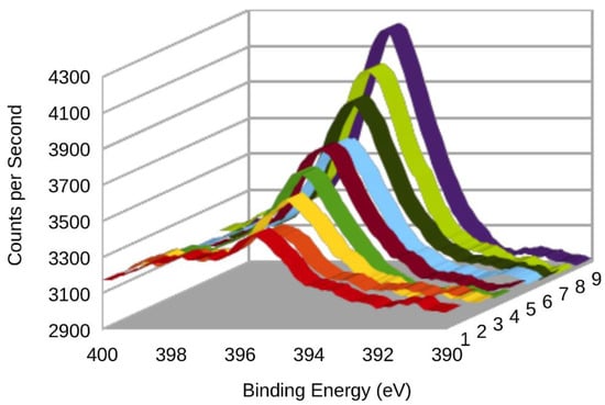 Since XPS is an extremely surface-sensitive analytical technique, examining exclusively the top ~10 nm, it is possible to use an ion beam to mill into the surface, and thereby obtain depth profiling information, the results of which are as shown in Figure 12. Here the numbers 1 to 9 refer to successively deeper XPS measurements and show that the nitrogen peak becomes progressively stronger with increasing depth.