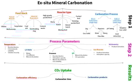 Mineral sequestration techniques are often divided into in situ or ex situ manner. In situ sequestration requires injecting CO2 into underground reservoirs to start a reaction with the existing underground minerals to form carbonates. Ex situ sequestration is related to carbonation process above the ground, where the raw natural mineral needs to be mined and treated before it undergoes the carbonation process. The scope of this work focuses on ex situ mineral carbonation and its related mechanisms and applications.