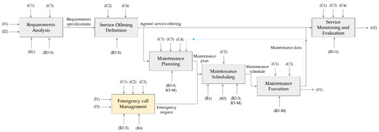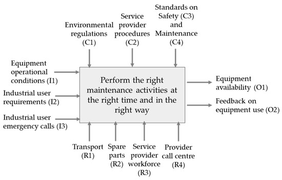 The inputs for the PBMS system include equipment operational conditions (I1) and industrial user requirements (I2) which come from a deeper knowledge on the customer needs and requirements related to the equipment performance and context. The outcomes of the PBMS system are mainly twofold: the expected and agreed equipment availability level (O1) and feedback on the equipment use (O2) that can be of great value for the service provider and the equipment manufacturer. The resources needed have been identified as transport means (R1), spare parts (R2), service provider workforce (R3) and call center of the service provider (R4). The controls for the PBMS system operation are environmental regulations (C1), service provider internal procedures (C2), safety standards (C3) and maintenance standards (C4). The latter includes standards such as EN 17007 [75] and EN 15341 [76]. The EN 17007 [75] provides a generic description of maintenance processes, their characteristics, necessary inputs, expected outputs and the interactions between different processes. The EN 15341 [76] provides a comprehensive list of maintenance measures and key performance indicators. These standards will be fundamental for the service offering definition and the planning of maintenance actions and interventions during the service delivery.