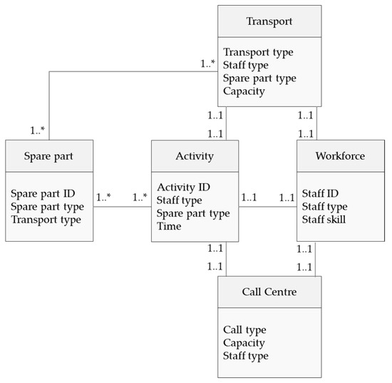 The system structure has been defined by using an UML class diagram, where all objects inside the system are identified by a set of attributes and methods. Five objects were identified at this stage: transport, workforce, spare part, activity, call center. The UML class diagram explains their relations and attributes and is shown in Figure 3.