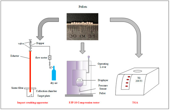 Impact crushing of the pellet was carried out using an apparatus built by ourselves, as shown in Figure 1, according to the literature [33,34,35]. A high-pressure air bottle with a volumetric flow meter was used to control the velocity of air flow, and two valves were used to feed samples without the escaping of gas and particles. Particles were accelerated in an educator (1.2 m in length and 10 mm in I.D) by air at a speed of 18 m/s and impacted a stainless target (inclined by 60° with respect to the vertical direction) in the collection chamber. To filter the entrained fine particle (<12 μm), a sintered porous metal plate was installed on the top of the chamber.