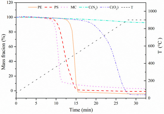 To understand thermal properties of pore-forming materials, they were first tested in the TGA at a constant ramping rate of 30 °C/min to 900 °C followed by isothermal calcination for 5 min, and the results are shown in Figure 2. It was seen that under the atmosphere of N2, MC, PS, and PE started to pyrolyze at 300–400 °C with a quick weight loss until they were completely decomposed. In contrast, there was almost no decomposition of C in N2 flow. When the atmosphere was switched to a flow containing 15 vol. % O2 balanced with N2, C was observed to start burning at 600 °C until it was burnt out at around 900 °C. Based on the decomposition characteristics, it can be concluded that all pore-forming materials would be burnt into gases to create pores without any solid residues left in the prepared sorbent pellets.