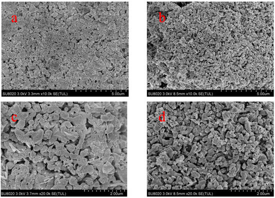 To see the effect of pore-forming materials on the structure of sorbent pellets, cross-sectional images were captured of the calcined CH and CH-PE5 using the field emission scanning electron microscopy, and the results are depicted in Figure 3. It is very clear that grains and pores in CH-PE5 are much smaller and their distributions are more uniform than those in the sample of CH. These differences can be attributed to the positive pore-forming effect of PE on sorbents microstructure during its decomposition to gaseous phases. The roles of pore-formers could be further understood from the results of the N2 adsorption/desorption test. Table 1 summarizes the specific surface area, BJH average pore width, and pore volume of CH and CH-PE5. It is seen that CH-PE5 pellets have a BET surface area of 11.66 m2/g, BJH cumulative pore volume of 0.0436 cm3/g, and an average pore diameter of 15.2 nm, which are all superior to those of CH. Figure 4 indicates that the higher pore volume of CH-PE5 is mainly correlated to pores of size in the range of 2–40 nm, which also contributed to the higher specific surface area in comparison with CH. Based on these results, it is reasonable to predict that the better microstructure of CH-PE5 would lead to an easier diffusion of CO2 within the sorbent and the following carbonation reaction.
