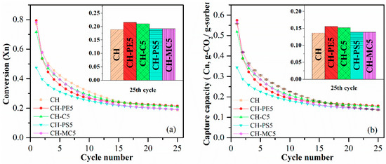 Cyclic CO2 uptake capacity and CaO conversion of sorbent pellets prepared with different pore-formers were presented in Figure 5. It shows that CH possesses a CO2 capture around 0.556 g-CO2/g-sorbents initially, but the value quickly decreased to 0.136 g-CO2/g-sorbent after 25 cycles. For sorbent pellets with the addition of pore-forming materials in preparation, CH-PE5 shows the highest CO2 capture capacity of 0.574 g-CO2/g-sorbent in the first cycle and 0.155 g-CO2/g-sorbent after 25 cycles, which are both higher than those of CH. This is in accordance with the aforementioned characterization results, demonstrating that CH-PE5 modified inner structure of sorbents during the pyrolysis of PE, resulted in a shifting of pores to smaller sizes of 2–40 nm (see Figure 4), and an increase of surface area and pore volume (see Table 1). It is well known that a bigger pore volume means a smaller CO2 transfer resistance, and a higher specific surface area could supply more available sites in pellets to react with CO2 [32,34]. Thus, CO2 sorption performance of CH-PE5 was improved. The CH-C5 shows a similar CO2 uptake capacity, which is only slightly lower than CH-PE5 but higher than CH. For CH-PS5 and CH-MC5, no improvement in sorption performance was observed compared to CH. The CaO conversion, the other aspect of sorption property, shares the same trend with the CO2 uptake capacity.