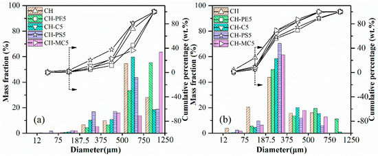 The results of impact crushing test are shown in Figure 7. By comparing particle size distribution after impact crushing, attrition resistance of diverse sorbent pellets could be evaluated. Obviously, the anti-attrition ability of fresh pellets is much better than calcined pellets, which, however, is more meaningful in the practical CaL application. That is our focus in the following work. It is seen that when particles smaller than 187.5 μm are regarded as completely crushed materials, the mass loss fraction of CH pellets reach to nearly 24.4% from the cumulative percentage results. In contrast, the value for CH-PE5% and CH-C5 was only around 5.9% and 5.2%, respectively. Meanwhile, the mass fraction of residual particles within a diameter range of 750–1250 μm is 11.2% for CH-PE5 from the mass fraction results, which is the highest. These results indicate that the addition of a small amount pore-formers enhances the mechanical strength of sorbent pellets. It is possible that the pores formed during the pyrolysis of pore-formers at a relatively low temperature are able to act as channels for the release of CO2 in the decomposition of CaCO3, avoiding the formation of additional cracks, and is beneficial for keeping the mechanical strength.