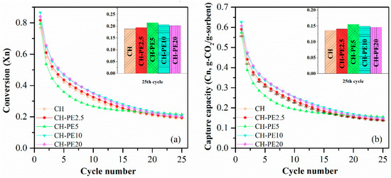 Figure 8 shows that CO2 sorption capacity of all CH-PE samples were improved under the conditions studied. A tendency of first-increase-then-decrease was observed with the increasing addition of PE, and the peak appears when 5 wt. % PE was utilized. Theoretically, with the increasing addition of pore-forming materials, CO2 sorption performance should keep going up. However, it never happened in our experiment. The reason could be that the most suitable pore size range for long cyclic CO2 capture is 20–50 nm [35]. However, the addition of too much PE would result in pores that are out of the aforementioned optimum range and lead to a loss in CO2 capacity in a long cycle.
