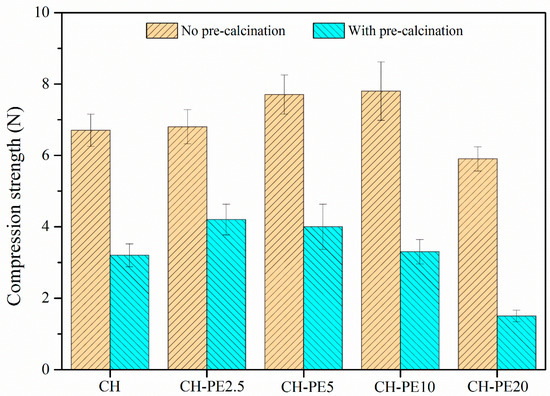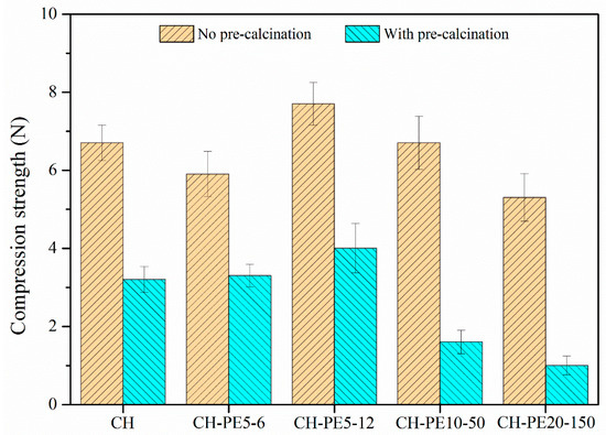 Compressive strength of synthetic sorbent pellets with different particle sizes of PE are shown in Figure 12. A tendency of first-increase-then-decrease compressive strength was observed with the increasing particle size of PE, for both fresh and calcined pellets. The CH-PE5-12 possessed the biggest compressive strength among all calcined pellets while CH-PE5-150 was the worst. The ratio of the mechanical strength value for pellets after calcination to fresh pellet was also calculated in order to understand the influence of different particle sizes. The value is 55.9%, 51.9%, 23.9%, and 18.9% for CH-PE5-6, CH-PE5-12, CH-PE5-50, and CH-PE5-150, respectively, showing that bigger particle size of the pore-former has a negative effect in maintaining the compressive strength of pellets during high-temperature calcination.