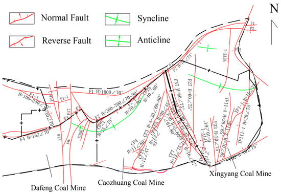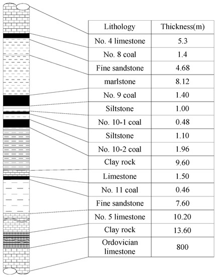 The target coal seam is the #8 coal seam in Caozhuang Coal Mine CO., LTD of Feicheng Bureau of Shandong Energy Group CO., LTD. The #8 coal seam, excavated by coal panel 81006, has a depth of 550 m and belongs to the lower coal groups of the Northern China coal field. The coal seam has a mean thickness of 1.96 m, dips at an angle of 12–29°, and has a protodyakonov coefficient of 1.5. The immediate roof is the No. 4 limestone with a thickness of 5.3 m, and the floor is fine sandstone with a thickness of 4.78 m. The stratigraphic column of the mine field is shown in Figure 3. There are two water aquifers beneath the floor. The No. 5 limestone aquifer, with a bursting coefficient of 0.18 Mpa/m before mining, is 38 m away from the floor. The Ordovician limestone, with a bursting coefficient of 0.11 Mpa/m, is 61 m away from the floor. Additionally, faulted structures in the mine field are very complicated. The coal panel is severely threatened by the No. 5 and Ordovician limestone aquifers. Hence, the water-inrushing risks should not be overlooked.