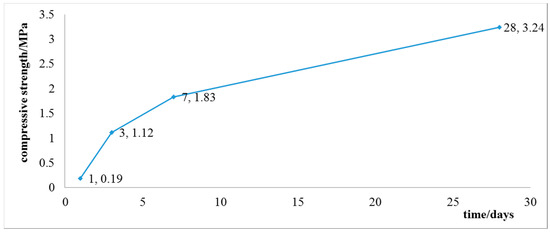 Paste-like backfill material is utilized in coal panel 81006 of Caozhuang Coal Mine. The material is comprised of cement, gangue powder, and coal ash, with a ratio of 1.8:6:6. The mass percentage of the backfilling slurry is 60%, and the specific gravity is 1.56. The backfill uniaxial compressive strength with time is shown in Figure 4. The backfill material production process is shown in Figure 5.