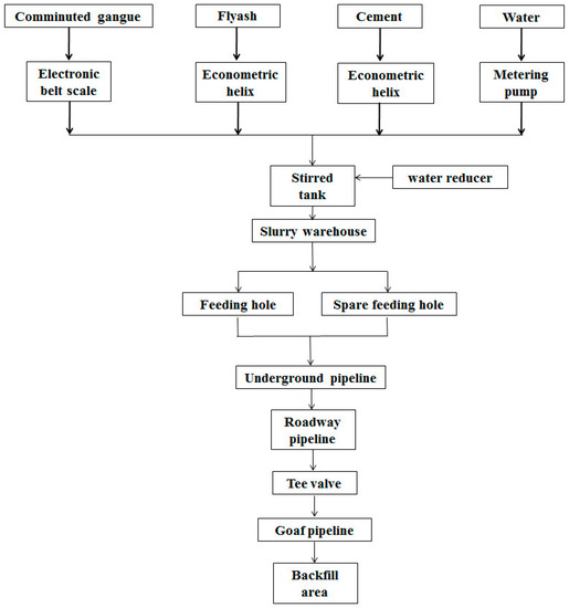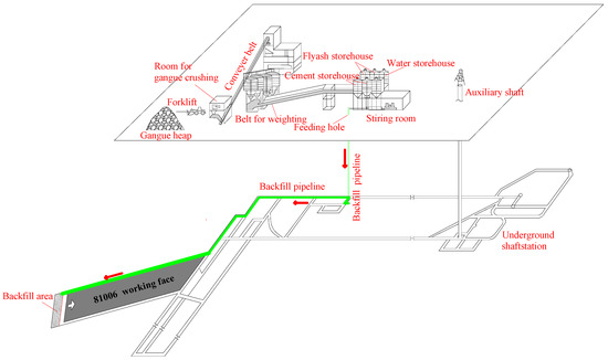 The system consists of surface parts and underground parts. The backfill system has the characteristics of simple operation, real-time monitoring, tube-plugging reduction, and suitable transportation intensity. Material feeding, stirring, and transferring are controlled automatically in the backfill system. The surface system has 6 parts: The material production system, the material storage system, the water, and power supply system, the automatic control and metering system, the monitoring and communicating system, and the emergency system. The underground system has 2 parts, including the pipeline delivery and slurry-resistance systems in the coal panel. Upward mining was adopted in the longwall coal panel. Therefore, while the backfill system ran, the backfill material could flow down to the goaf. The coal panel layout is shown in Figure 7.