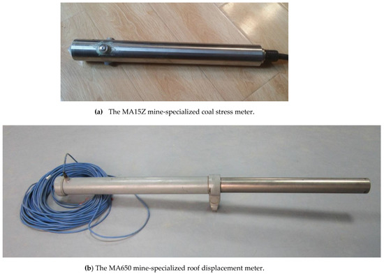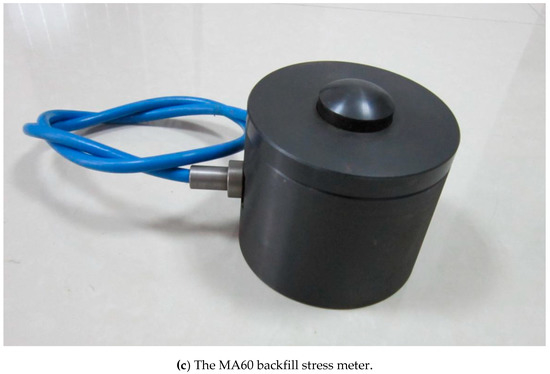 To evaluate the effect of backfill mining, a dynamic monitoring system consisting of several meters was installed in the coal and backfill area. These meters were the MA15Z coal mass stress meter, MA650 roof displacement meter, and MA60 backfill stress meter (all shown in Figure 8), manufactured by Xian Xinyuan Company in China. Monitoring data consisted of APD beyond coal panels, the RFD inside backfill areas, and the vertical stress inside backfill areas. The MA15Z mine-specialized coal mass stress meters have a wide measuring range of 10 MPa and high accuracy of 0.01 MPa. They were able to monitor APD in front of the coal wall. For best performance, the MA15Z should be installed in a borehole ahead of the working face prior to mining.
