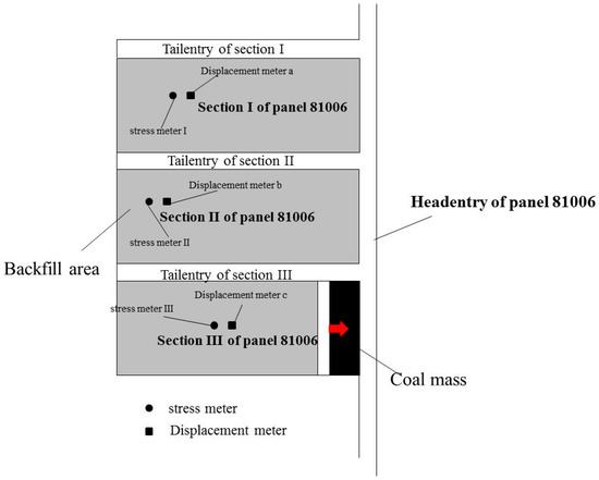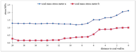 As the working face advanced, the monitoring system received data during the whole process. The MA15Z mine-specialized coal stress meters were installed into the coal mass before mining; the others were installed in the backfill area. The meters’ layout is shown in Figure 9.