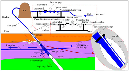 Isolated borehole section flow testing is used in many coal mines due to its simple construction/installation and data analysis as well as low cost. The detection system consists of a testing device, a plugging control device, a water injection control device, and connector pipes as shown in Figure 10. It has two separate loops, including a plugging loop and a water injection loop. The packers at the ends of the testing device are used to isolate sections of the boreholes under the control of the plugging control device, and the leakage rate in the isolated section can be used to learn the failure condition of the strata.