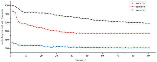 It took about 70 days until the roof and the floor were stable, and the greatest RFD was 104 mm. The mining height is calculated as 2 m and the compression ratio of the backfill is 5.2%. The greatest RFDs at b and c are 93 mm and 129 mm, and the compression ratios are 4.74% and 6.45%, respectively. The curve variation rules of b and c are basically the same as that of displacement meter a.