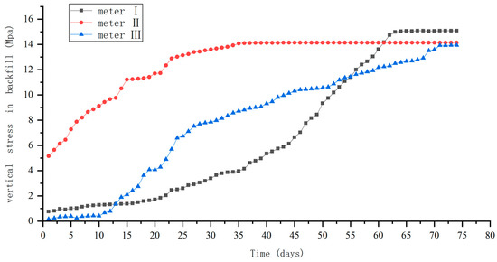 Inside the backfill area, several backfill stress meters were installed to monitor the vertical stress variations with the advancement of the working face. As shown in Figure 13, the curve graph was drawn based on the data obtained by monitoring.