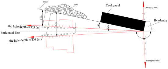 According to the probing data, the graph of the leakage rate of all drill holes was drawn as shown in Figure 14. From Figure 14, drill hole D1 has a certain leakage amount from depths of 14–19 m. The leakage rate of other segments in D1 is zero, indicating that rock fractures developed in this segment, which is the floor failure zone. Drill hole D2 has a certain leakage amount from depths of 12–14 m, indicating that rock fractures developed in this segment, which is the floor failure zone. Analyzing the probing results of the two drill holes, the FFD is 4.64 m. From Figure 15, D1 has a certain leakage amount above a depth of 25 m, while the leakage amounts of other segments are zero, indicating that rock fractures developed in this segment. D2 has a certain amount of leakage above a depth of 27 m, indicating that rock fractures developed in this segment. Therefore, after analyzing the probing results of the two drill holes, the greatest FFD is 6.73 m.