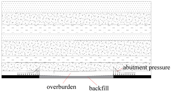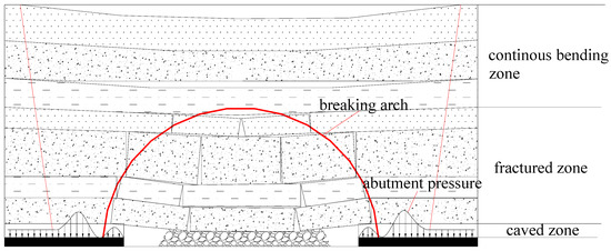 From the comprehensive analysis of the above characteristics, it is concluded that backfill mining with the paste-like material is quite different from traditional longwall mining. In traditional longwall mining, coal extraction results in the lower strata losing their original balanced state, bending, falling, and then creating rooms for the upper strata’s motion. As the coal face advances, the overburden moves upward from the bottom. According to the differences in the magnitude of strata movement, the overburden is normally divided into three zones: The caved zone, fractured zone, and continuous bending zone (abbreviated as “three zones”) [16,17,19], as shown in Figure 16. As the working face advances, the overburden’s weight that is no longer supported by coal mass due to coal extraction moves to the surrounding rock in which the concentrated stress, called abutment pressure, forms. Generally, the concentrating coefficient K of the abutment pressure can reach 2–3, thus forming the plastic zone in front of the coal face.