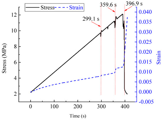 It can be seen from Figure 5 that with increasing loading time, the stress and strain on the specimen gradually rose. Stress and strain suddenly changed at small amplitudes both at 299.1 s and 359.6 s, implying that the great damage appeared in the local zone of the specimen. Moreover, the local crack expansion resulted in the instant increase of the specimen deformation while stress fluctuated. With the constant loading, stress and strain constantly rose. At 396.9 s, the primary crack was found and therefore the structure of the specimen lost stable. In this case, stress dramatically and suddenly changed and rapidly reduced while strain rapidly increased.