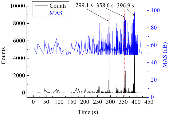 Previous research shows that under the effect of external load, the coal mass is damaged to thus lead to the initiation and expansion of cracks, consequently triggering numerous AE events [30]. Dislocation and slippage between particles in coal matrix can also induce the fracturing of bridge bonds between coal molecules, consequently generating AE phenomenon [33]. AE counts characterize the times of micro-cracking happening during damage and fracturing of the coal mass while the amplitude of the signals reflects the strength of micro-cracking. The parameters related to AE can be used to describe the evolution process of damage and crack expansion and release process of energies in the coal mass, to further judge the deformation and fracturing of the coal specimen and predict the occurrence of failure of the coal specimen [20]. Figure 6 shows the curves of AE counts and MAS (mean amplitude strength) with respect to loading time under gas pressure of 2 MPa.