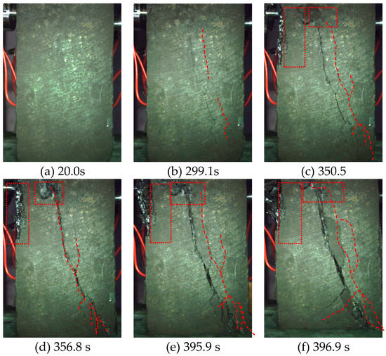 As shown in Figure 7, in the early stage of loading (for example, at 20.0 s), although accumulated damage of the specimen was present, it was insignificant, and no micro-crack was formed on the surface of the specimen. With increasing stress, the micro-defects and micro-cracks in the coal-rock mass gradually aggregated and connected in local zones after undergoing constant extension and expansion in the early stage, showing certain self-organization, thus triggering the generation of micro-cracks in the coal-rock mass. At 299.1 s, stress suddenly changed at a small amplitude and therefore two separated thin and long micro-cracks were formed on the surface of the specimen. At 350.5 s, the damage and fracturing of the coal mass aggravated and two previous micro-cracks mutually cut through and further expanded to thus form multiple secondary cracks. Additionally, microscopic breakage appeared at the left side of the specimen and the top inclined to the left. At 356.8 s, the stress approximated to the maximum, and the width and length of the primary cracks further rose, and the number of secondary cracks increased and constantly expanded. The damage zones at the left side and the top of the specimen were expanded and therefore the damage degree increased. At 395.9 s, the cracks in the middle part in the frontage of the specimen expanded and gradually cut through while the cracks at the bottom were staggered. The structure of the coal mass became increasingly unstable. At 396.9 s, the primary crack occurred in the specimen while the cracks in the middle part were totally connected. Moreover, the width and length of cracks in the lower part witnessed great increases and the cracks at the bottom were connected. Additionally, secondary cracks developed into secondarily primary cracks. The through-running cracks showed the combination of tensile and shear failure. Repetition