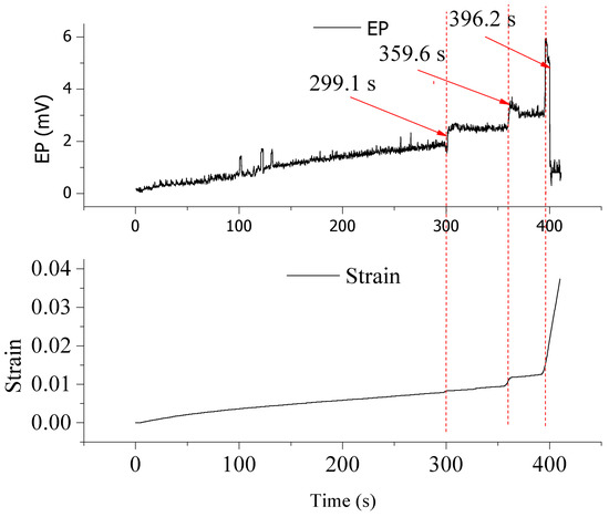 The strain’s response characteristics were similar to the stress response. The difference was that the large stress drop occurring at 299.1 s. Currently, since the specimen was still in the elastic loading stage, the strain changes little even the EP response was significant. When loading phase of sample becomes to be plastic phase, especially around the failure, the strain response became more significant. It indicated that the strain monitoring is more sensitive when the specimen is plastic, especially for the main rupture.