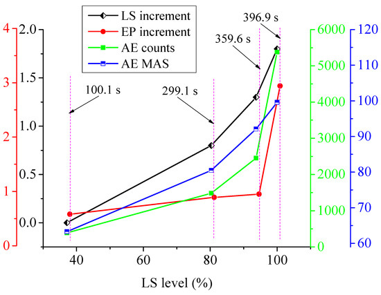 The representative time points were selected to calculate corresponding LS levels. On this basis, the abnormal response characteristics of EP, AE, and crack expansion are attained, as shown in Table 2 and their datum statistics is displayed in Figure 9.
