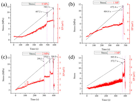 (3) As shown in Figure 11c, the EP maximum tended to occur before or after primary micro-cracks of specimens, which was the most significant characteristic of the EP abnormal response. With the increase of gas pressure, although the EP maximum slightly fluctuated, it generally rose, implying that gas pressure promoted the EP response and therefore EP maximum was at a high level, which was more valuable for analysis.