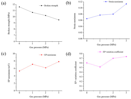 The broken strength, the strain maximum, the EP maximum, and the EP variation coefficient of specimens under different gas pressures were computed, as shown in Figure 11.