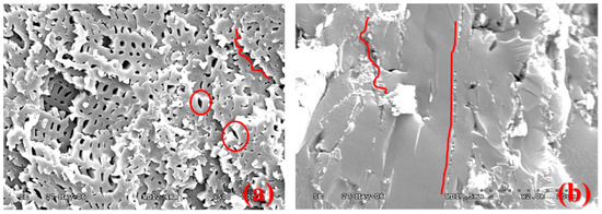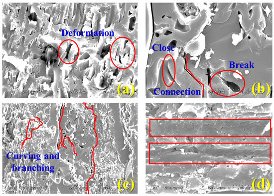 After gas is fully absorbed by the coal mass, surface free energy of pores reduces [41]. As a result, the attractive force between coal molecules on the fracture surface decreases and the capability of matrix for restricting coal molecules weakens, triggering the expansion-induced deformation of coal matrixes. Microscopically, the change is reflected by the reduced cohesion between coal matrix particles, which finally reduces the force and energy required during failure of the coal mass, and therefore the failure strength declines while the deformation amount increases. This has been verified in the results of Section 3.2, as shown in Figure 10a,b. Additionally, the free-state gas enters large microscopic fractures in the coal mass under the effect of pore pressure to therefore strengthen the effective normal stress, and the structure of fractures will be split and expanded. Additionally, the frictional resistance of cracked surfaces will also be weakened. Moreover, the pore structure is changed, and the mechanical strength of pore structures reduced [42].