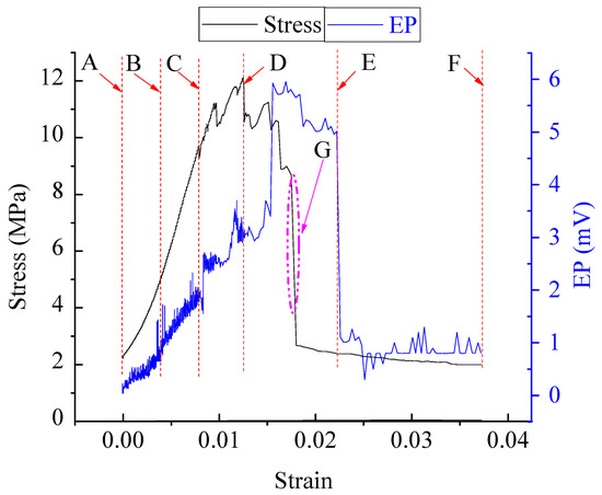 (1) AB stage: Under the effect of stress, the original structural plane and micro-cracks were compacted and closed gradually. Therefore, the EP intensity in the initial stage was generally low while greatly fluctuated. In terms of the EP effect in the stage, the friction effect generated due to the closure of primary crack surfaces mainly appeared while new cracks hardly occurred.