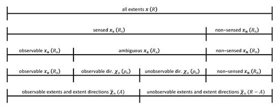 Based on this labeling, the vectors , , , and are defined to represent (i) the sensed extents, (ii) the non-sensed extents; (iii) the observable extents; and (iv) the ambiguous extents. This is illustrated in Figure 1.