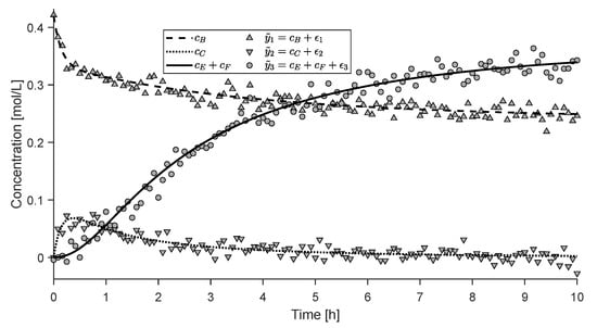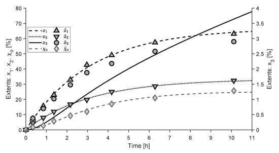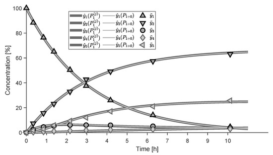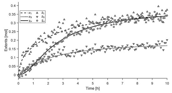 At the start of the batch experiment, only is present. As explained in [12], the concentrations of all species but are measured. The concentrations of are obtained by assuming that 3% of the transformed is present as at all times. Finally, all concentrations are normalized to 1 (100%). Figure 10 shows the experimental data reported in [12]. As the initial numbers of moles and the volume are unknown, we express both the concentrations and the extents as dimensionless fractions of the numbers of moles relative to the initial numbers of moles of . Hence, we can write .