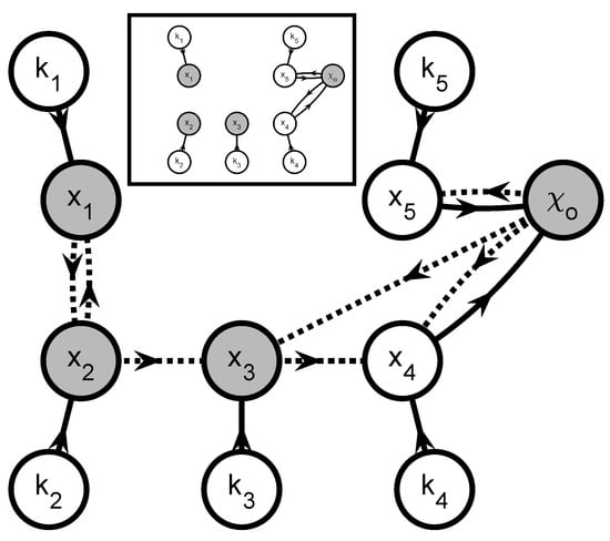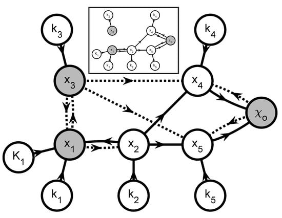 Scenario C—Graph . There are 4 shaded vertices corresponding to the observable extents , , , and . Removing the observation arcs results in 2 subgraphs for the parameters as shown in the inset: one graph in which , , , , and affect the observable extents , , and , and another graph in which affect the observable extent .