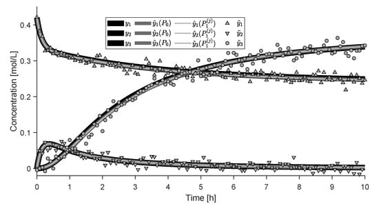 Figure 10 shows the measured concentrations and the simulated profiles obtained with (i) incremental parameter estimation (), followed by (ii) simultaneous parameter estimation with estimates obtained through incremental parameter estimation (). The parameter values obtained by solving , , , and are shown in Table 3. Note the final values obtained with both and are equal within numerical precision.
