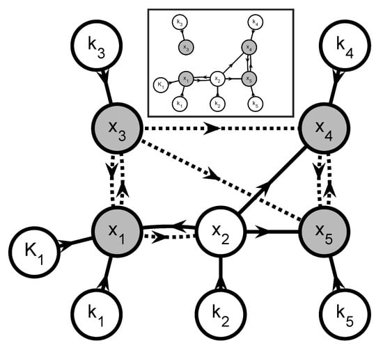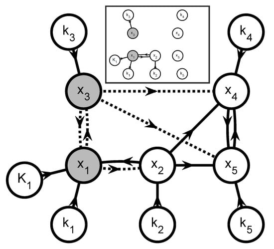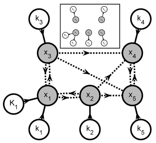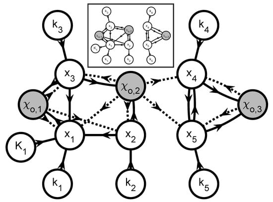 Figure 8 shows the corresponding graph , which can be partitioned into 2 subsystems. The first subgraph includes the parameters , , , and since they all have some effect on the observable extent directions and via a network that also involves the unobservable extents , , and . The second subgraph includes the parameters and that influence the observable extent direction via a network that also involves the unobservable extents and . Hence, this leads to two parameter estimation problems involving 4 and 2 parameters, respectively. The information flows to simulate each of the corresponding subsystems are shown in the inset of Figure 8.