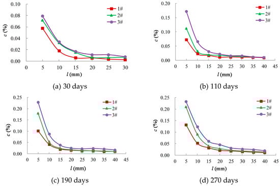 Figure 2 shows the variational curve of c against l in the concrete samples (c is the concentration of chloride ions in the concrete samples, and l is the depth from the specimen surface). Figure 2a–d correspond to the time points at 30, 110, 190, and 270 days, respectively. It was observed that c decreased with an increase in l. When l < 15 mm, c decreased rapidly, with an average decrease of 80.80%; when l > 15 mm, c decreased slowly, and the average decrease was only 39.10%. As stated previously, cyclic salt sprays were used as the mechanism of corrosion in this study. The intrusion of chloride ions was mainly driven by capillary actions and concentration gradients. Since the surface of the concrete was the first area that came into contact with the external chlorides, large quantities of chloride accumulated on the surface, resulting in a large chloride concentration gradient. By comparison, fewer chloride ions accumulated deep inside the concrete samples, and, consequently, the chloride ion concentrations were relatively small. It was also observed that, for the same l, c increased with an increase in the porosity; this is because a high porosity increases water and gas permeability, which promotes chloride accumulation.