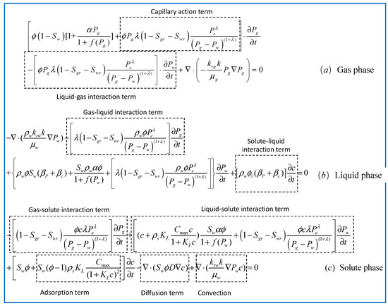 The model for coupled water–gas–chloride transport in unsaturated concrete consists of three parts: the flow model for the gaseous phase, the flow model for the liquid phase, and the convection–diffusion model for chloride ions, as shown in Figure 3a–c. This model accounts for the effects of convection, diffusion, chemical adsorption, and capillary action and reflects on the coupling effects between gas–liquid flows and solute transport in unsaturated porous media. The “gas phase term” represents the influence of the gas phase on the solute.
