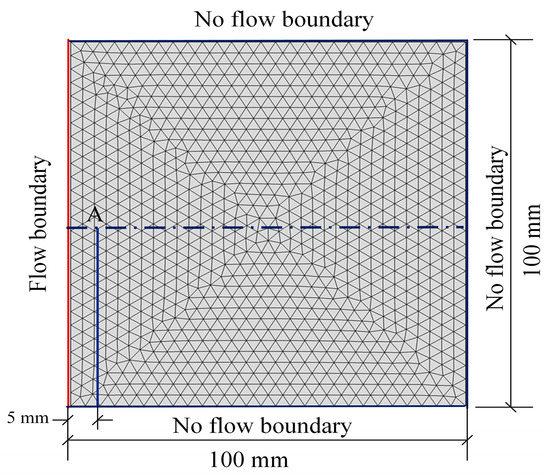 The geometrical dimensions of the numerical model were 100 × 100 mm. The left boundary was subjected to chloride corrosion, whereas the remaining boundaries were non-seepage boundaries. Point A was slightly above the central line and was 5 mm from the left boundary, as shown in Figure 4.